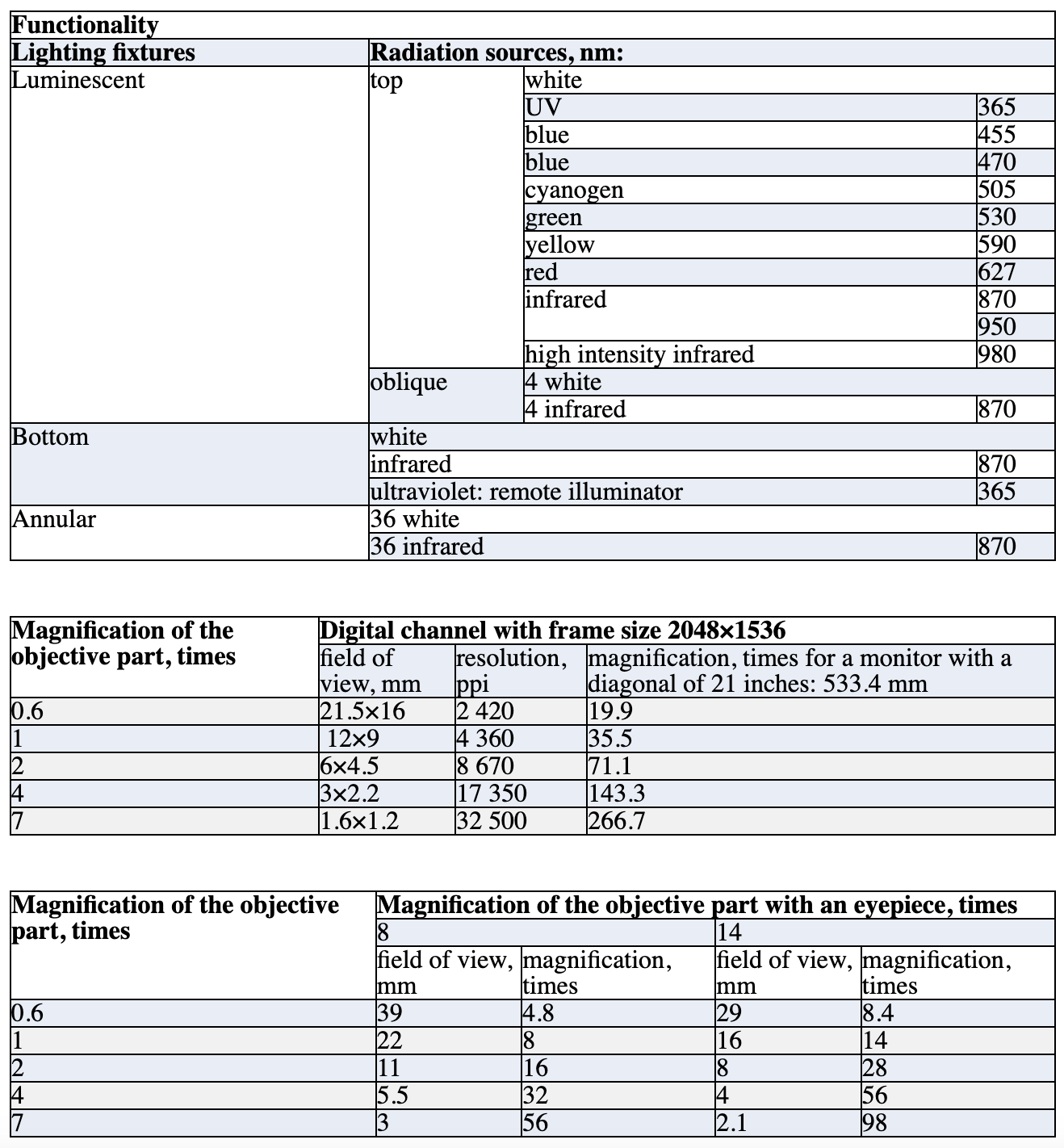 - Spectral luminescent — examination of objects in various spectral ranges with different arrangement of illuminators relative to the working surface: 7 radiation sources in the visible, infrared and ultraviolet ranges of the spectrum; 4 oblique white modes and 4 oblique infrared modes, designed to examine the microrelief of the surface.